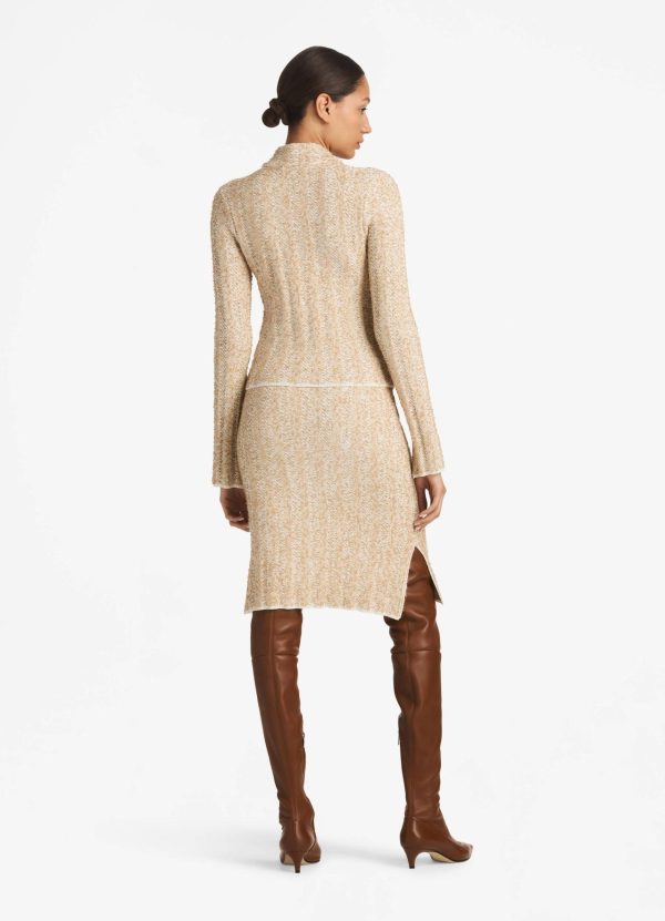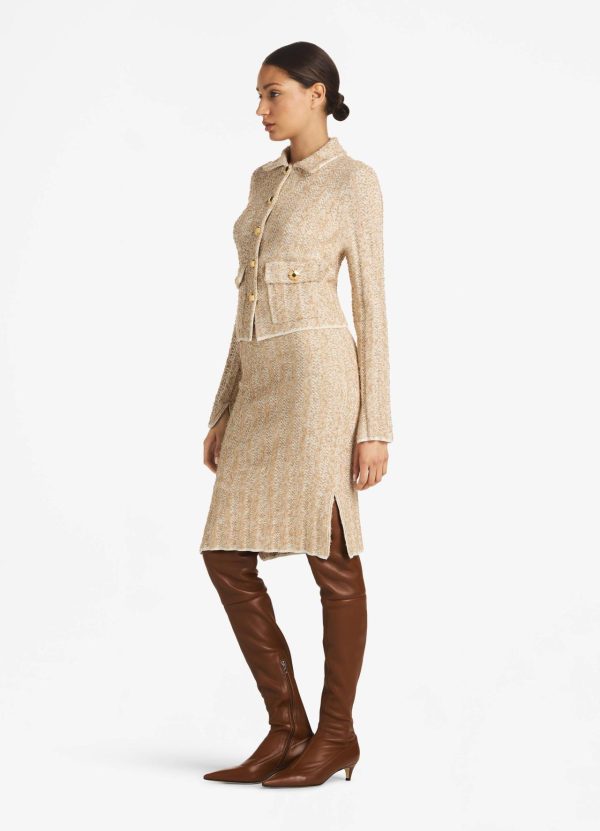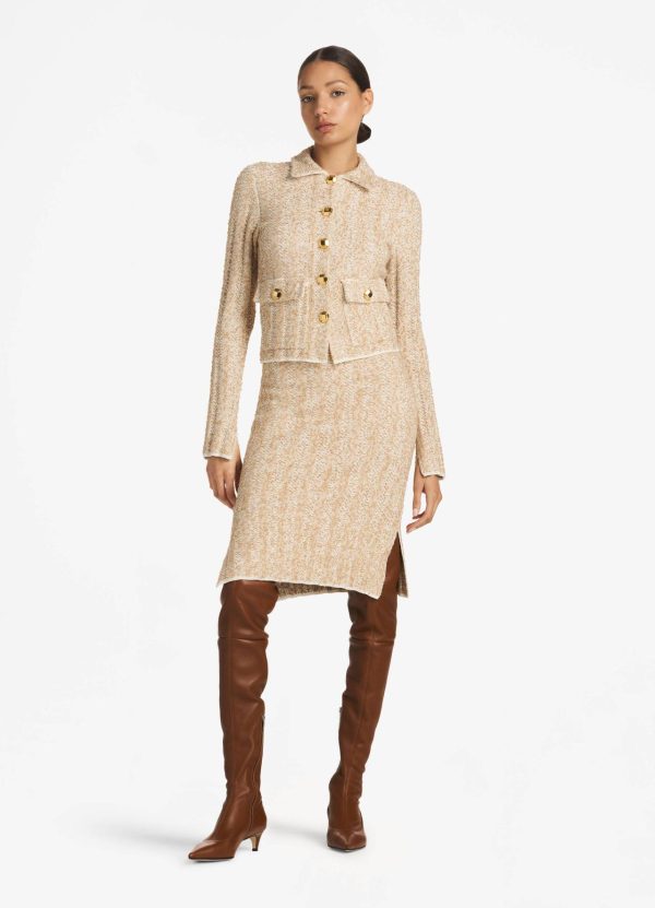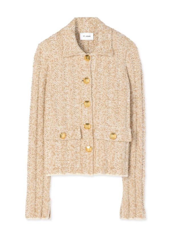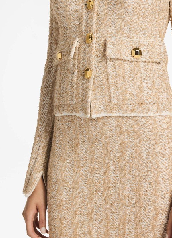 A versatile neutral emerges from a mix of dynamic yarns in a precise chevron stitch. Patch pockets, sleeve slits, and ribbed trims elevate the vintage-inspired style, as signature buttons decorate the details.