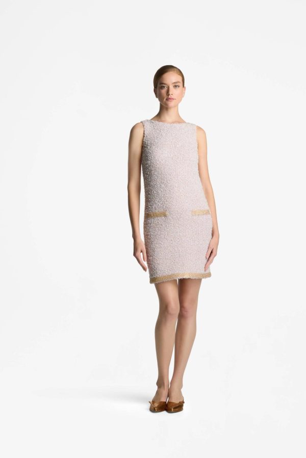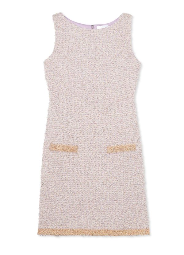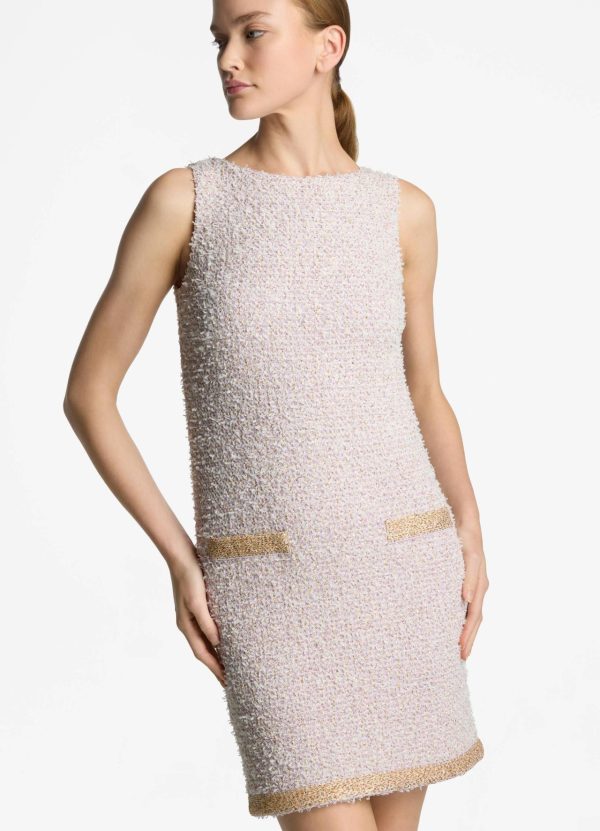 Texture meets sparkle in this pretty pastel-colored eyelash sequin tweed knit shift dress with contrast pockets and hem.