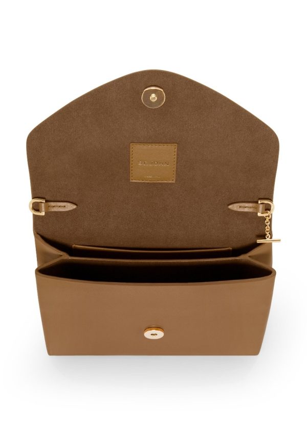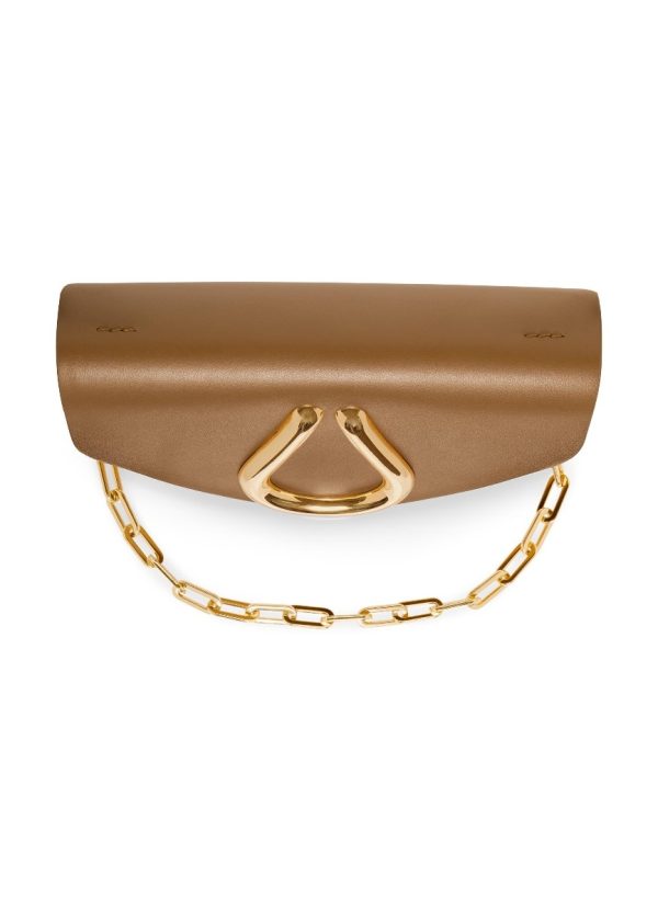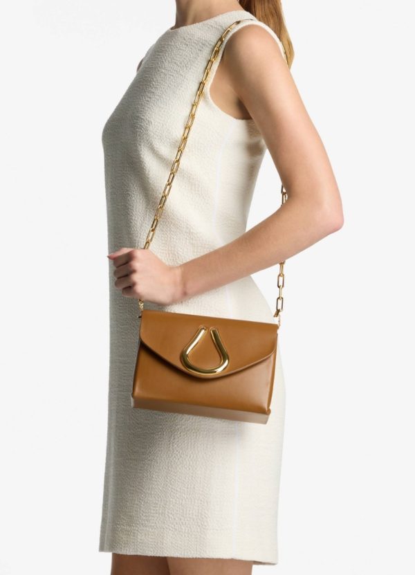 A lovely camel leather will go with everything. Featuring signature St. John loop hardware, leather and chain straps.