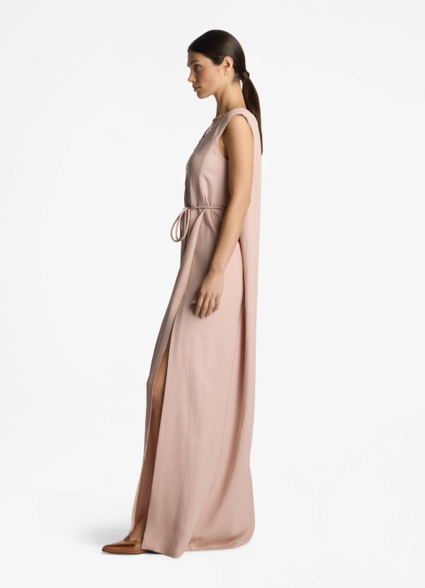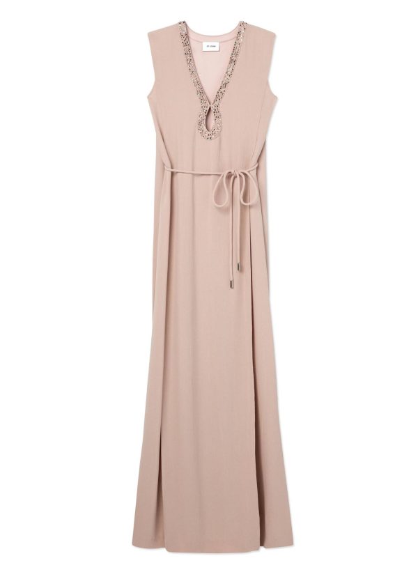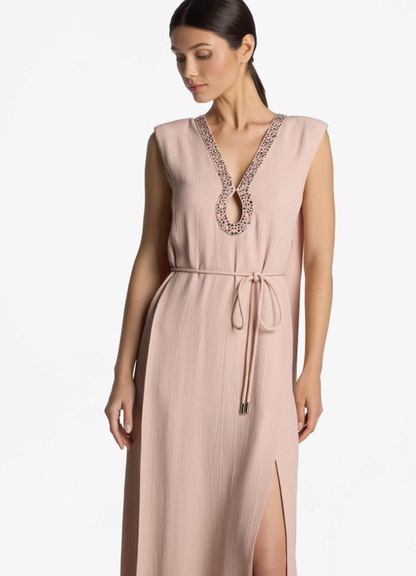 The definition of relaxed luxury, this hammered satin long gown is cut in a looser fit, with a keyhole V-neck drawing interest to the sequin detail at the neckline and a self-tying belt cinching the waist.