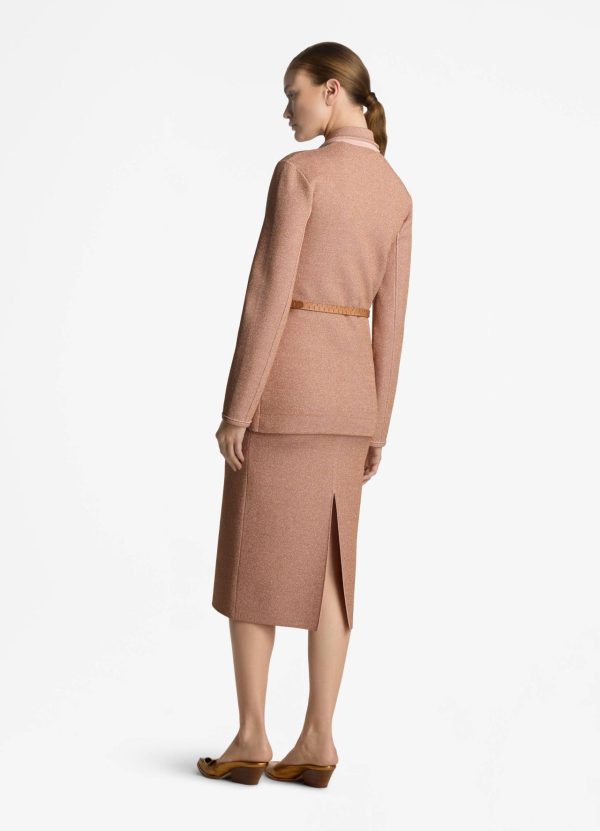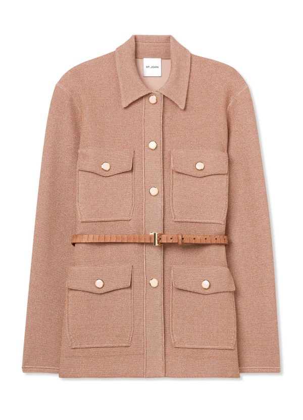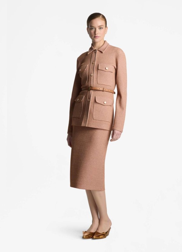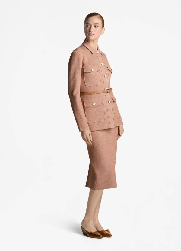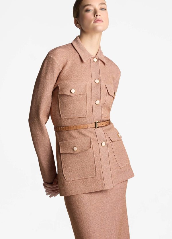 A soft-yet-structured lurex stretch pique knit makes for a comfortably chic jacket, as a sweet collar and buttoned pockets nod to the military style while remaining wholly feminine. A faux snakeskin belt highlights the waist.