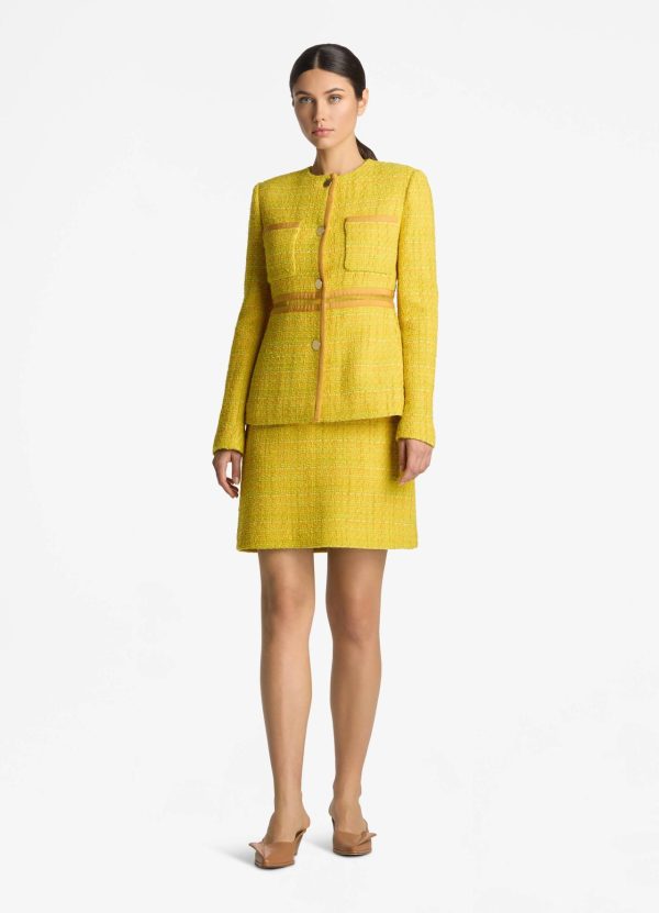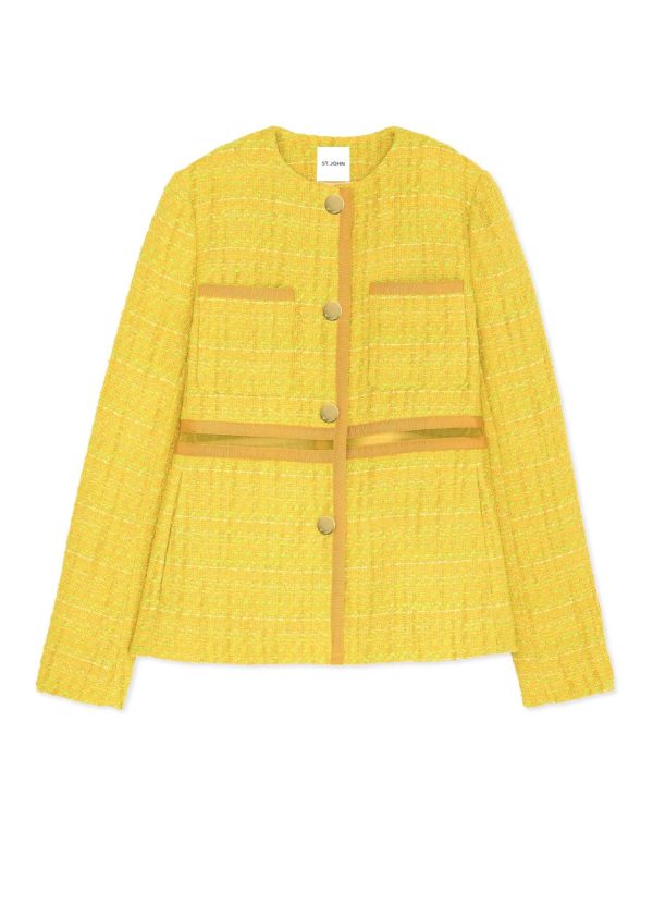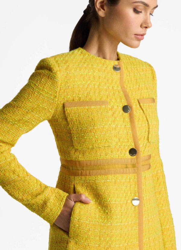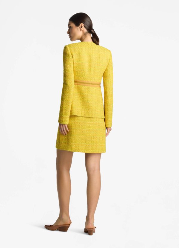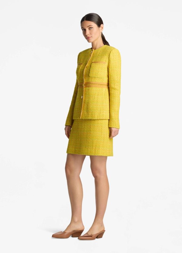 Textured lurex tweed adds depth to this round neck jacket, as statement organza inserts line a placket, pockets, and a flattering waistband.