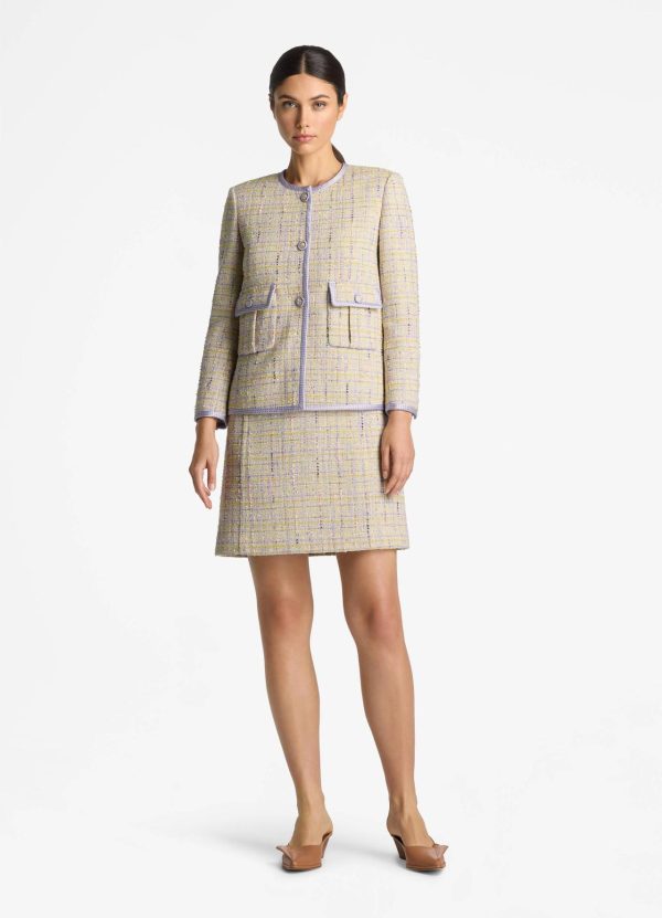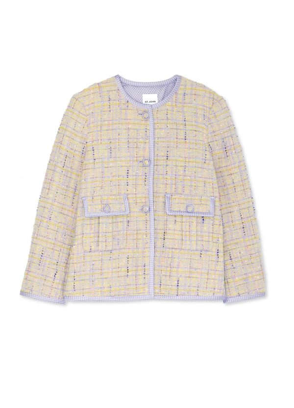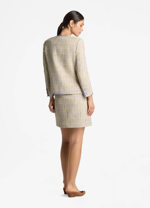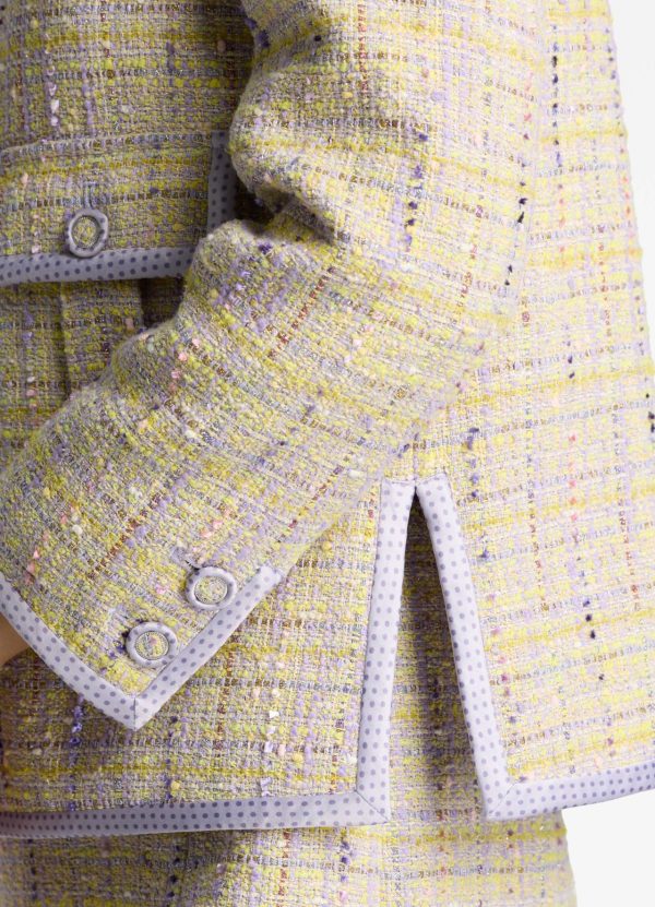 There’s an element of fun in this multicolored textured lurex slub tweed jacket with box pleat pockets and sweet polka dot trims.