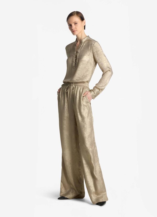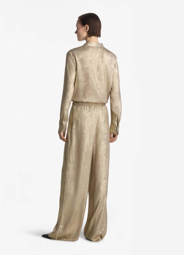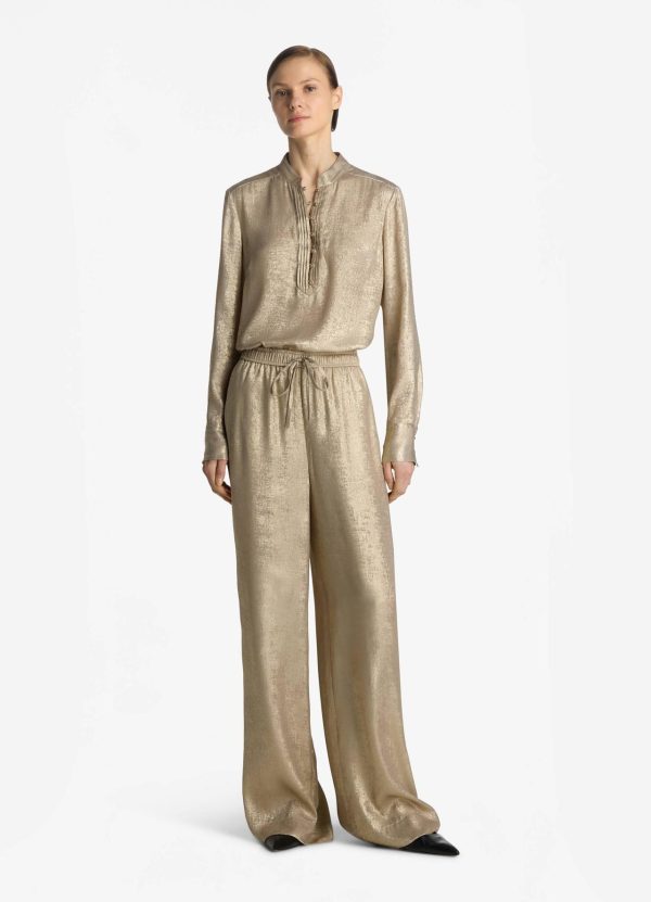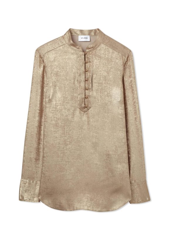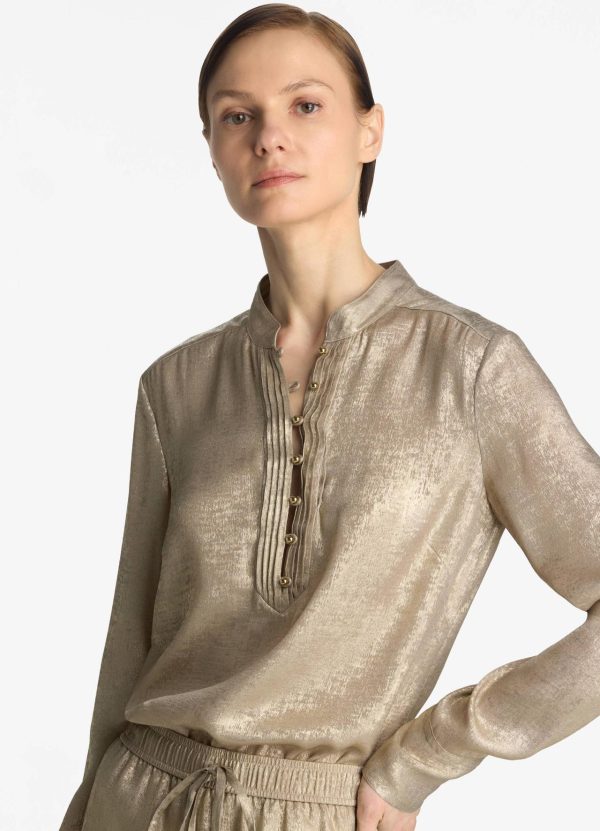 Shimmery gold draws the eye to this long sleeve metallic blouse with a Mandarin collar and front placket detailing.