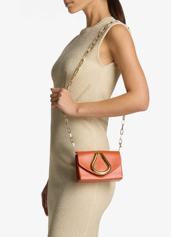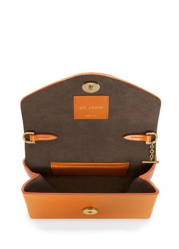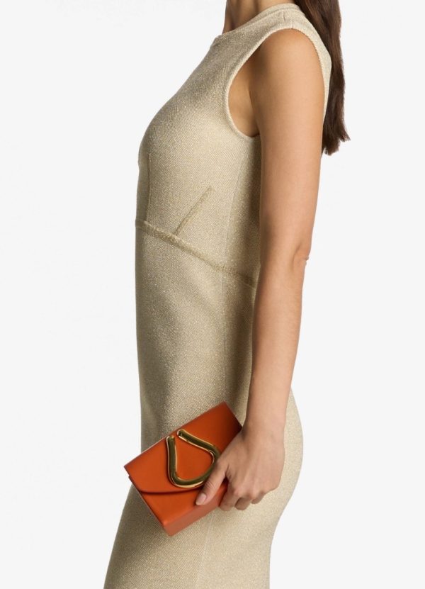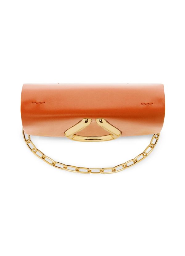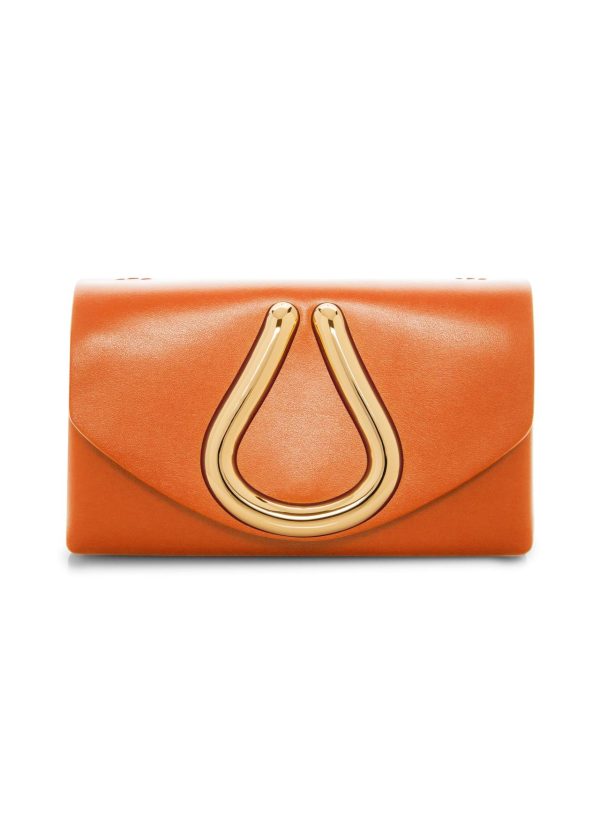 Leather clutch with signature loop detail at front and snap front, lined interior with side pockets.