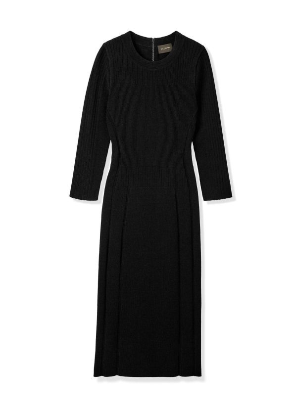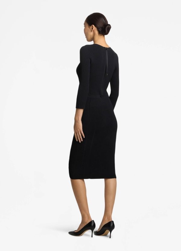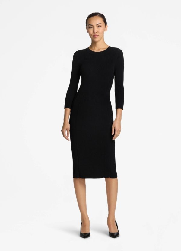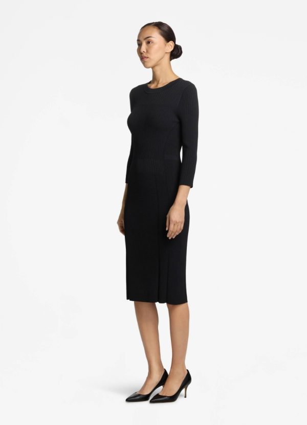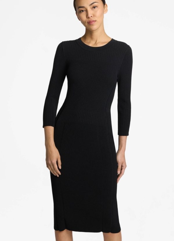 This figure-hugging 3/4 sleeve mixed rib dress will quickly become your go-to, as a contrast knit skirt detail emphasizes its flattering silhouette.