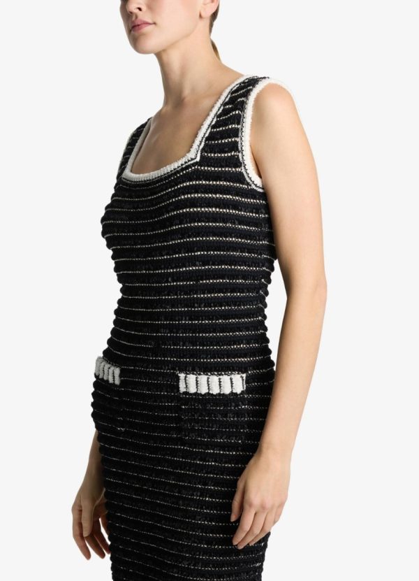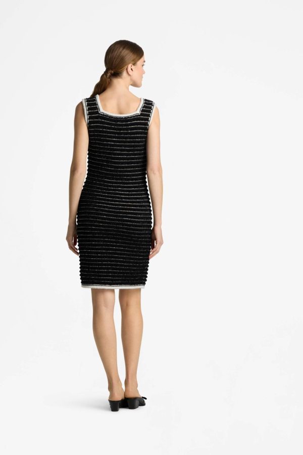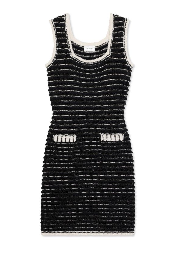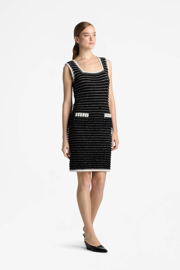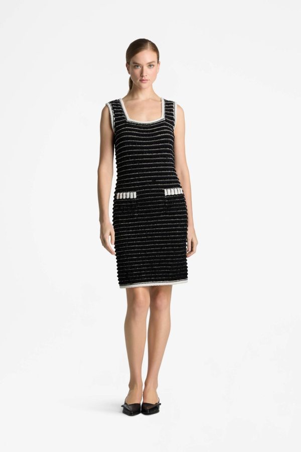 A mini dress that marries softness and structure, this timeless silhouette is crafted in tonal eyelash stretch tweed, showcasing horizontal striping with contrast knit trims and patch pockets for a playful touch.