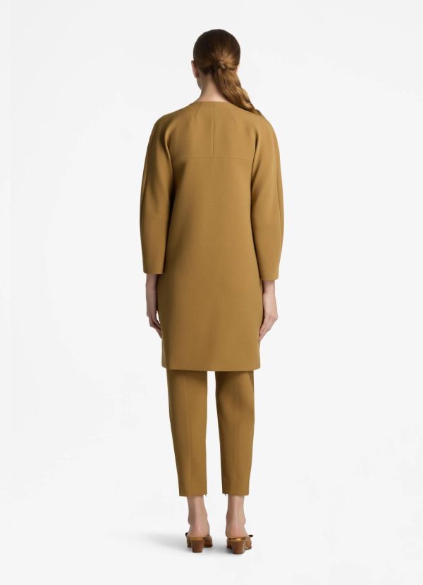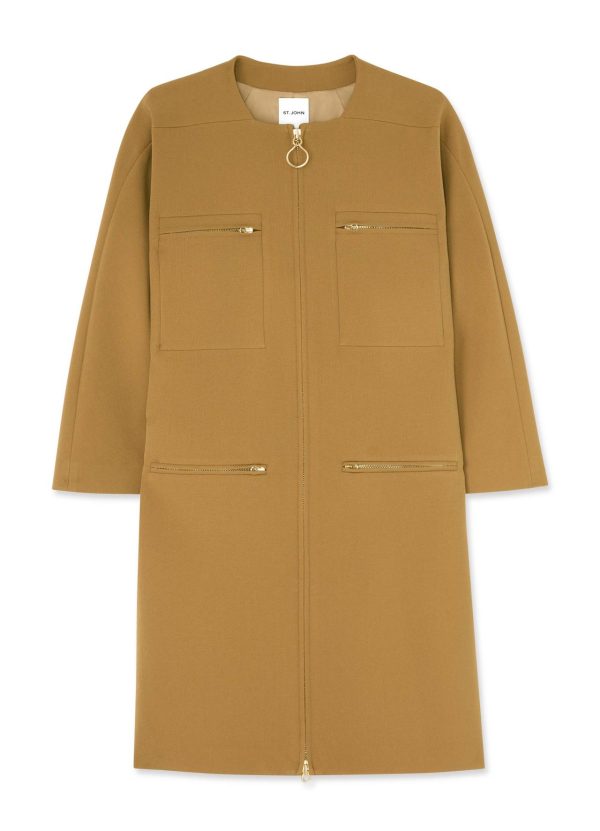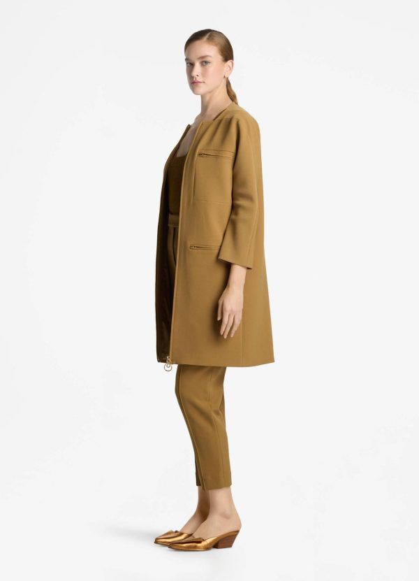 Long and lovely, this round neck stretch crepe suiting jacket adds refinement any look, with zipper details lining pockets and a front closure.