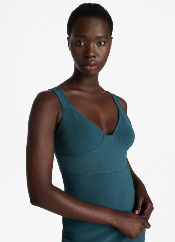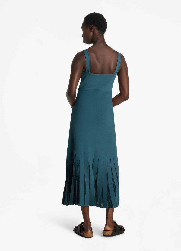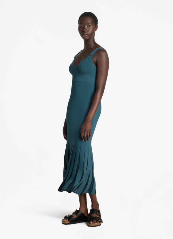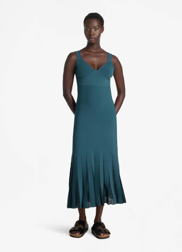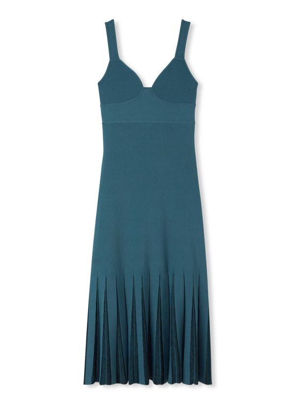 With a bustier-inspired strappy top and fitted empire waist, this stretch viscose evening knit dress ends with sheer pleats, showcasing the design detail with each movement.