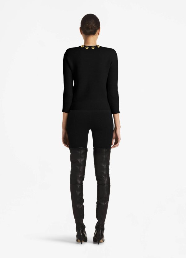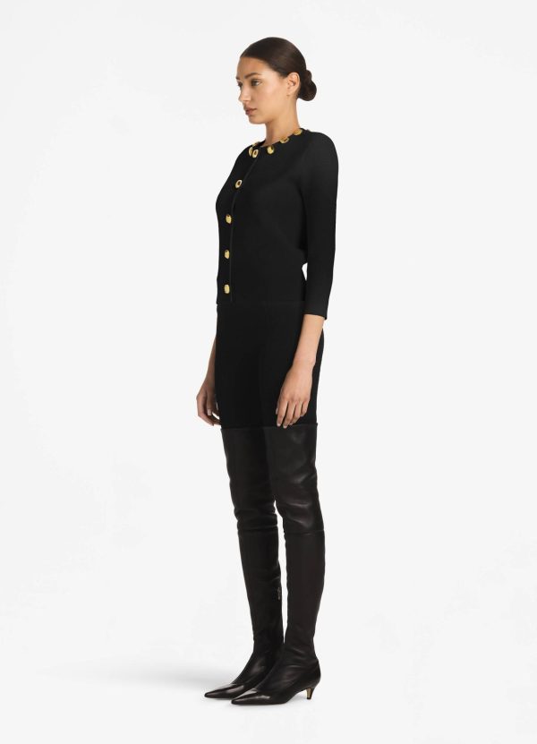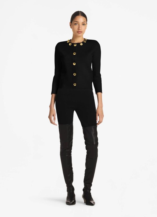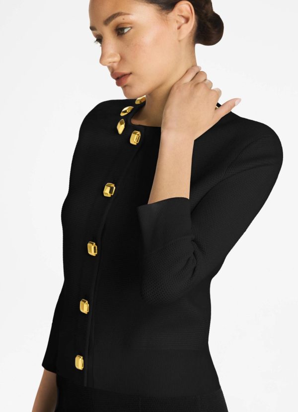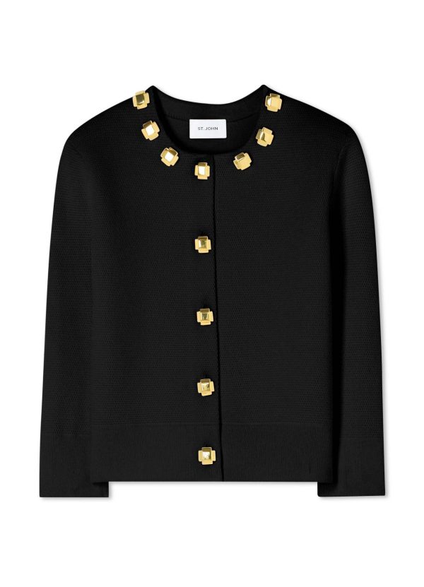 A classic pique knit crewneck cardigan gets a makeover with bold gold lining the collar and front. Worn open or buttoned, these studs are sure to stun.