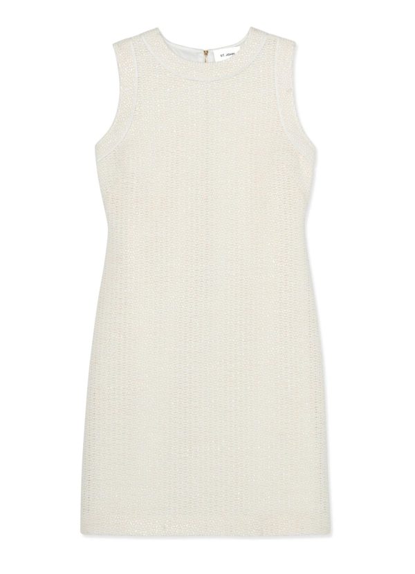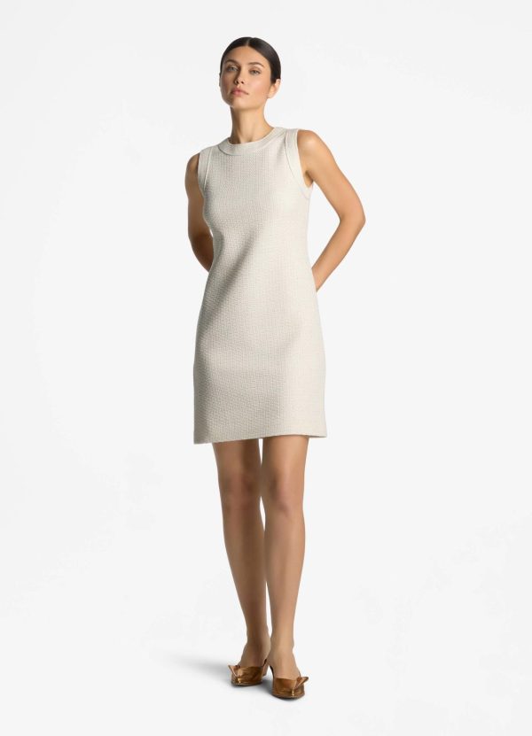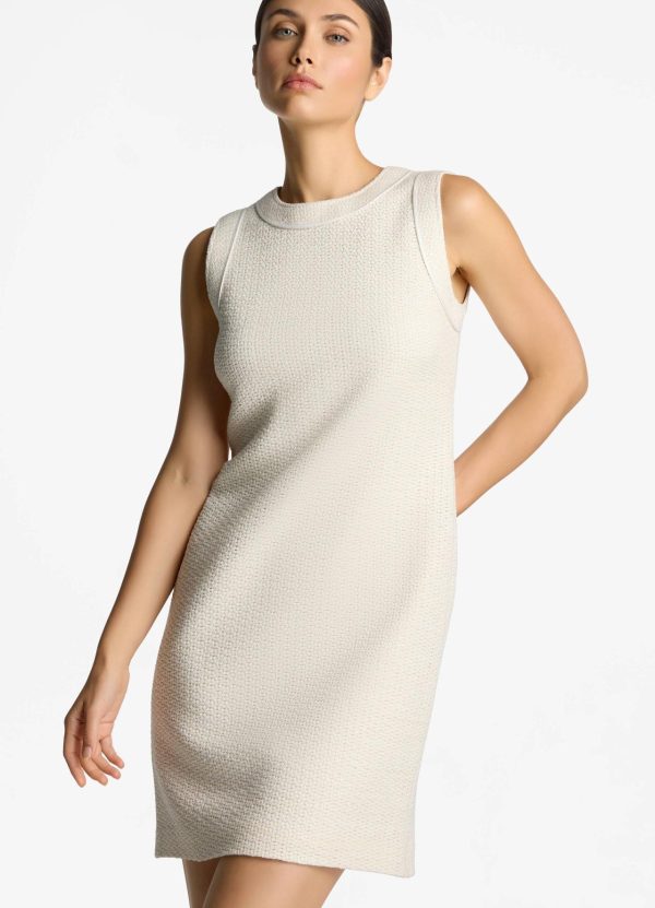 The intricate texture across this sleeveless, short open weave dress is a complement to the simple silhouette, while tonal knit trims finish the polished piece.